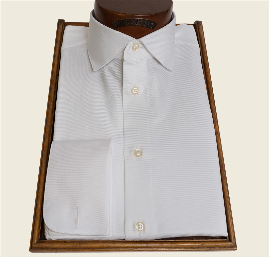 Camicia collo francese con stecca estraibile in tessuto di cotone 100% doppio ritorto Twill bianco, polso doppio con gemello. Confezione artigianale e tessuti rigorosamente realizzati in Italia. Lavabile in lavatrice.