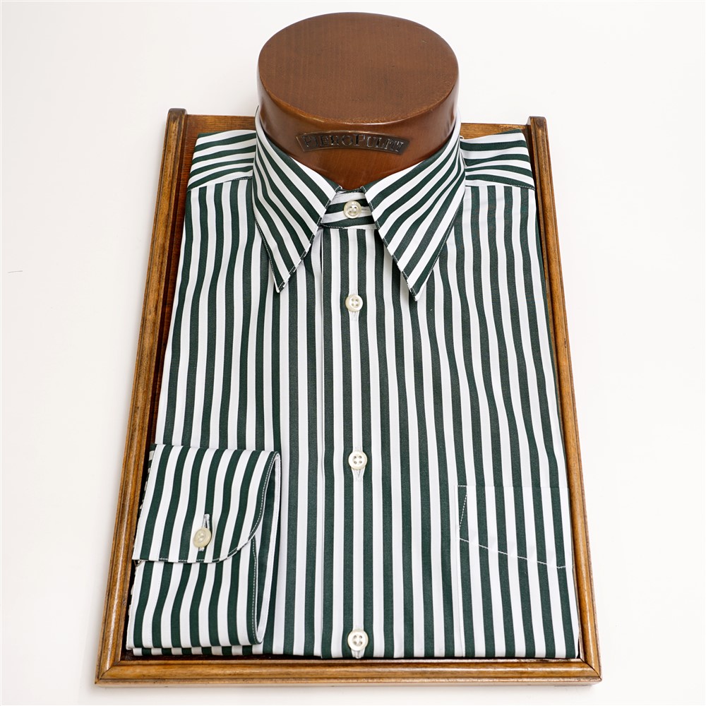 Camicia collo con bottoncini nascosti in tessuto di popeline di cotone con riga bold bianca e verde scuro, con taschino. Lavabile a basse temperature in lavatrice. Confezionata artigianalmente nel nostro laboratorio.