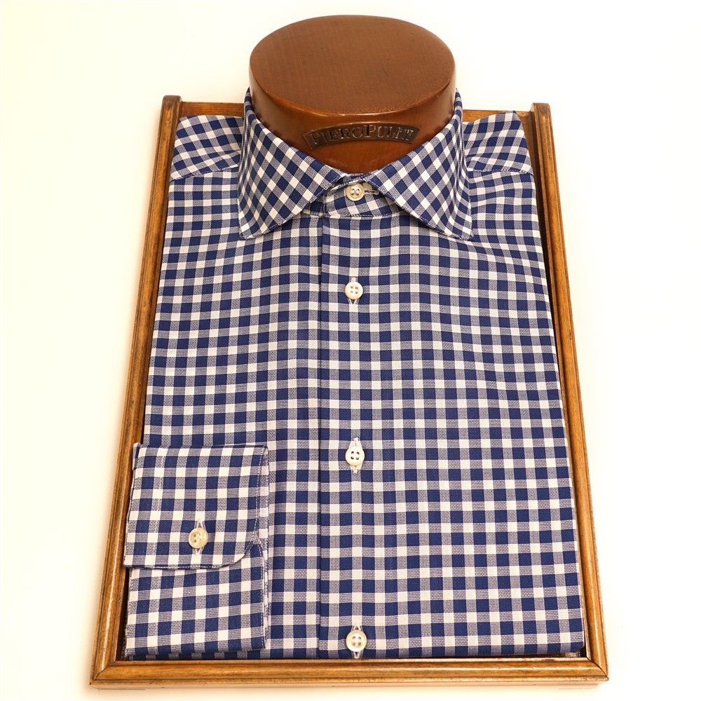 Camicia collo francese quadretto bianco e blu tessuto lavorato. Collo con stecche estraibili.