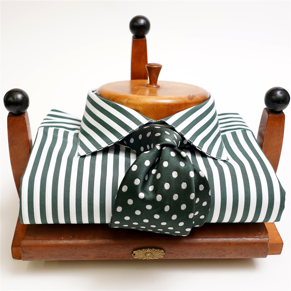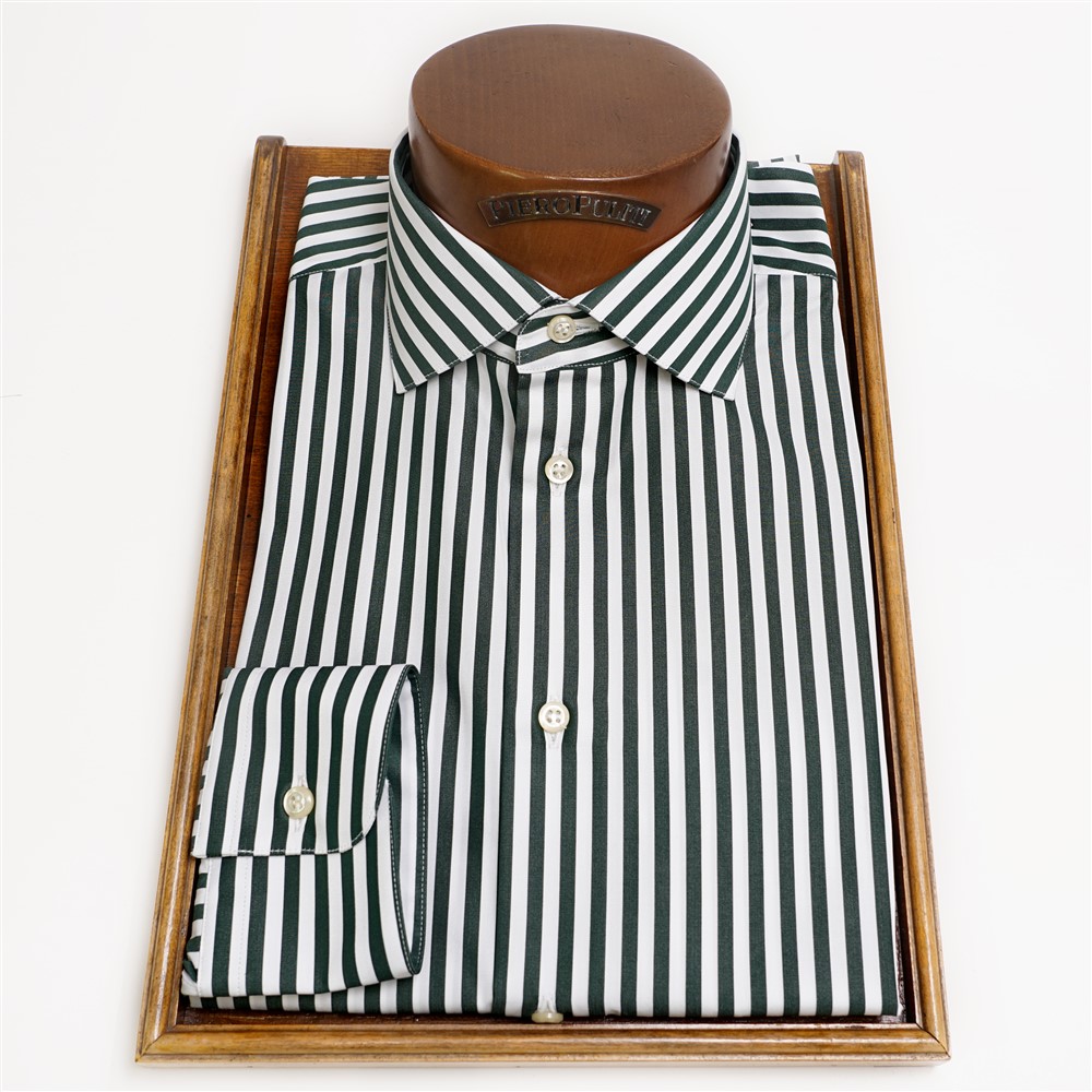 Camicia collo con stecca estraibilei in tessuto di popeline di cotone con riga bold bianca e verde scuro. Lavabile a basse temperature in lavatrice. Confezionata artigianalmente nel nostro laboratorio.