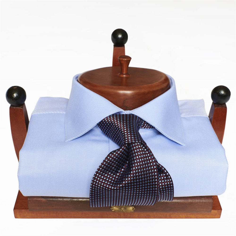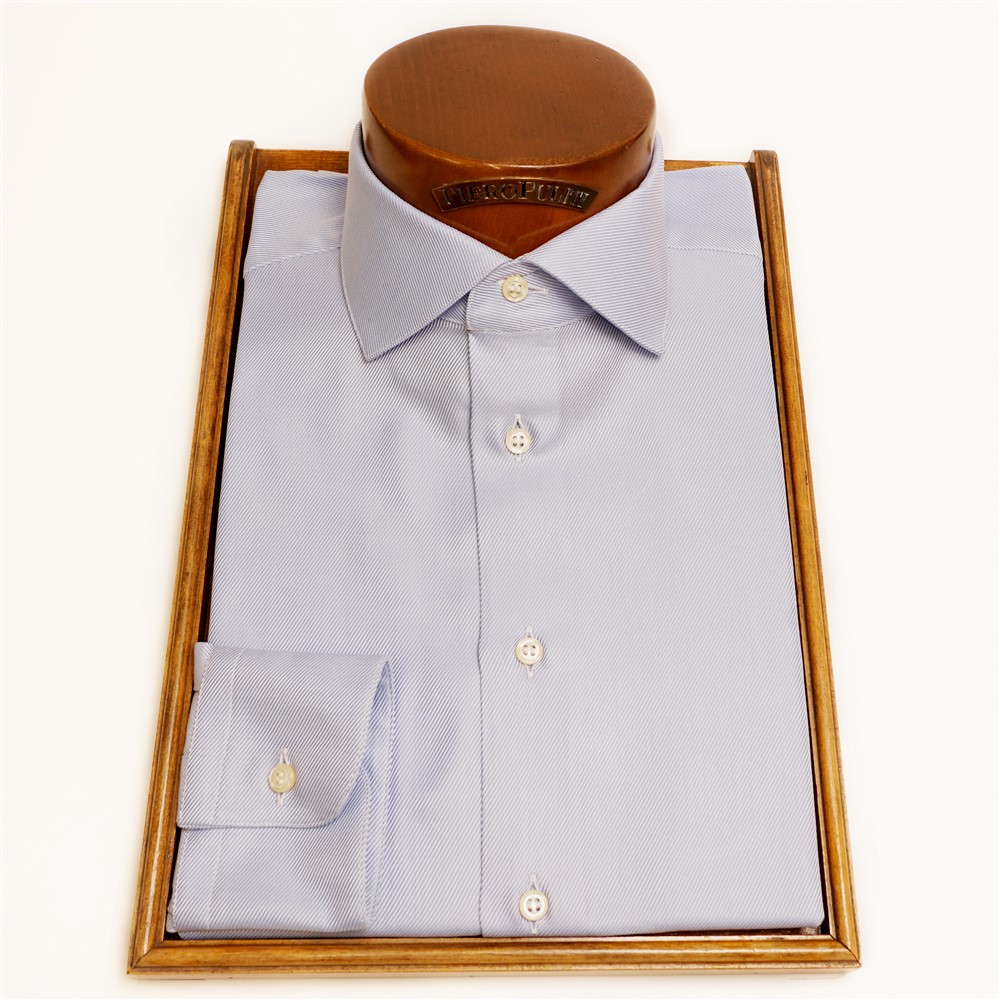 Camicia collo francese con stecca estraibile in tessuto di cotone 100% doppio ritorto Twill azzurro, polso con bottone. Confezione artigianale e tessuti rigorosamente realizzati in Italia. Lavabile in lavatrice.