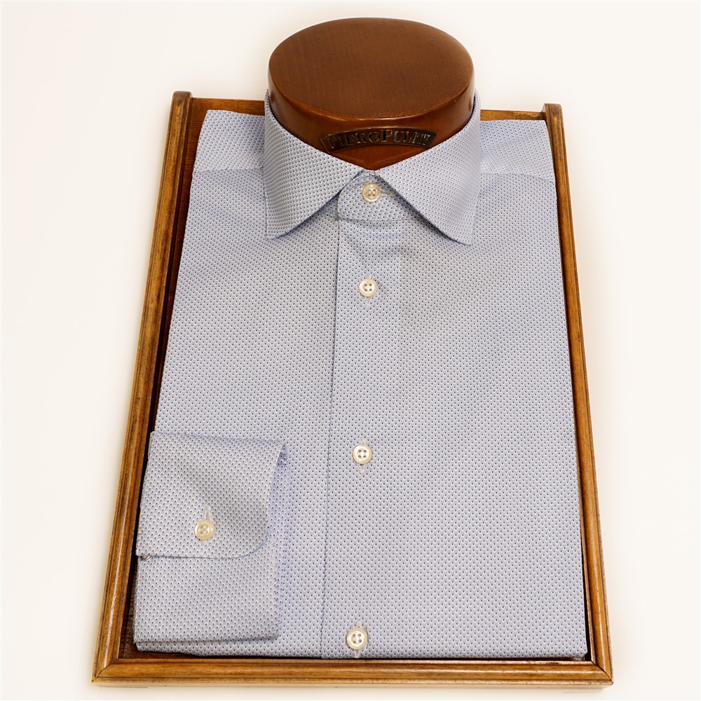 Camicia collo tipo francese celeste stampata con pallini blu