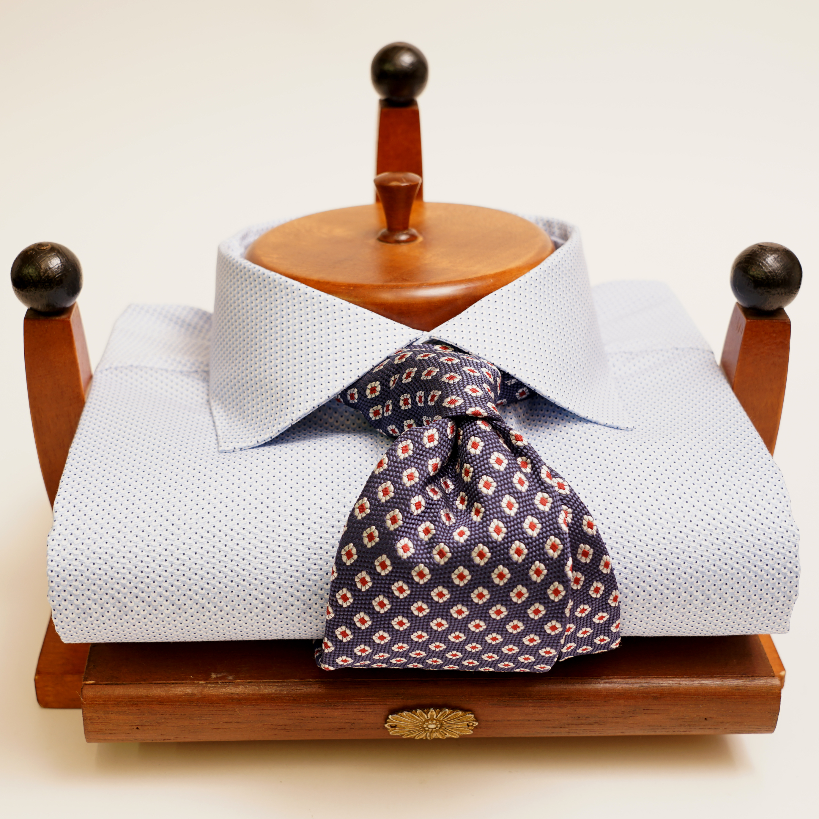 Camicia collo tipo francese in cotone celeste stampata con pallini blu.