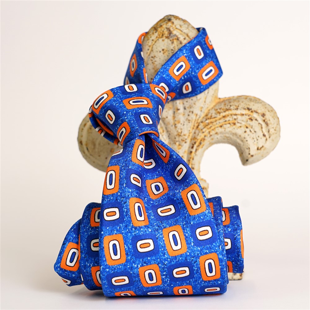 Cravatta con fondo marezzato azzurro con motivi geometrici arancio, bianco e blu navy, in seta 100% realizza per noi a Como. Cucita a mano lunga cm 150.