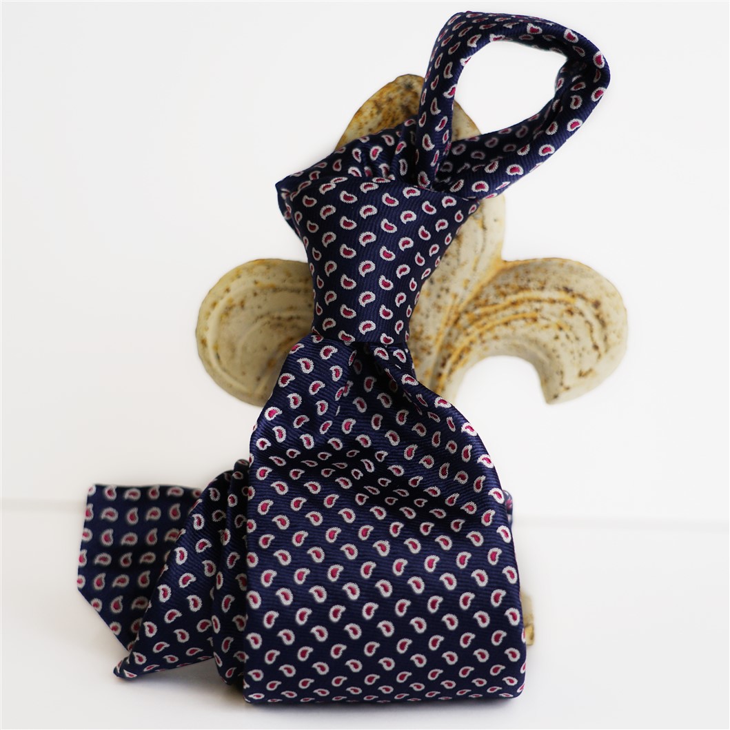Cravatta tinta in filo in pura seta di colore blue acceso con piccolo motivo a goccia bianco con interno rosso, cucita a mano. Dimensione della cravatta 150 cm di lunghezza con pala cn 7,5. Tessuto realizzato in esclusiva per noi a Como.