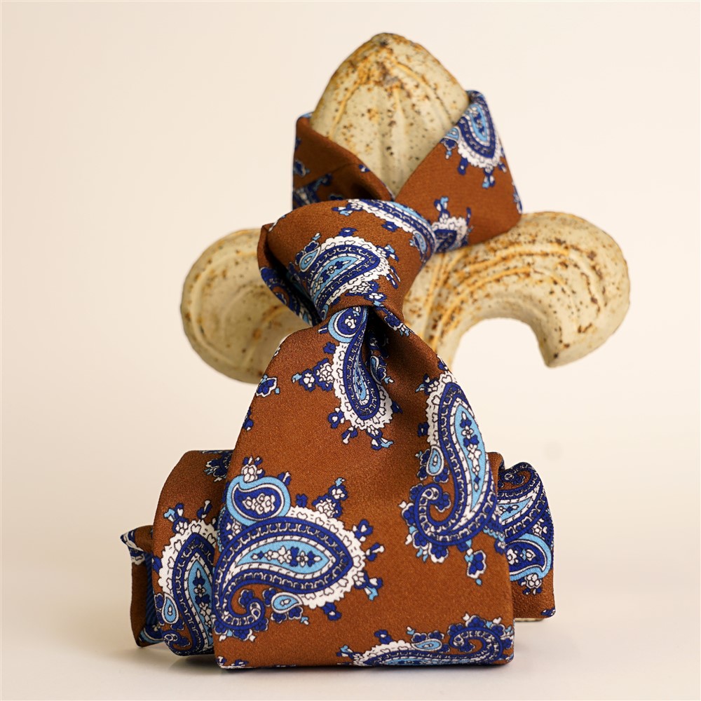 Cravatta stampata castagna con motivo paisley molto elaborato e ricco di particolari e colori. Il classico motivo a goccia con la punta ricurva di origini antiche che rimanda a mondi esotici e lontani. Un disegno diventato un classico nel mondo dei tessuti e della moda e divenuto uno dei motivi da cravatta più amato e che si rinnova ogni volta grazie alla combinazione di nuovi colori e forme. Abbiamo scelto questi colori che si sposano sia con la camicia azzurra che con la camicia bianca. La cravatta è di dimensioni 150 cm di lunghezza e 7,5 cm di larghezza della pala. Cucita a mano con tessuti realizzati per noi a Como.