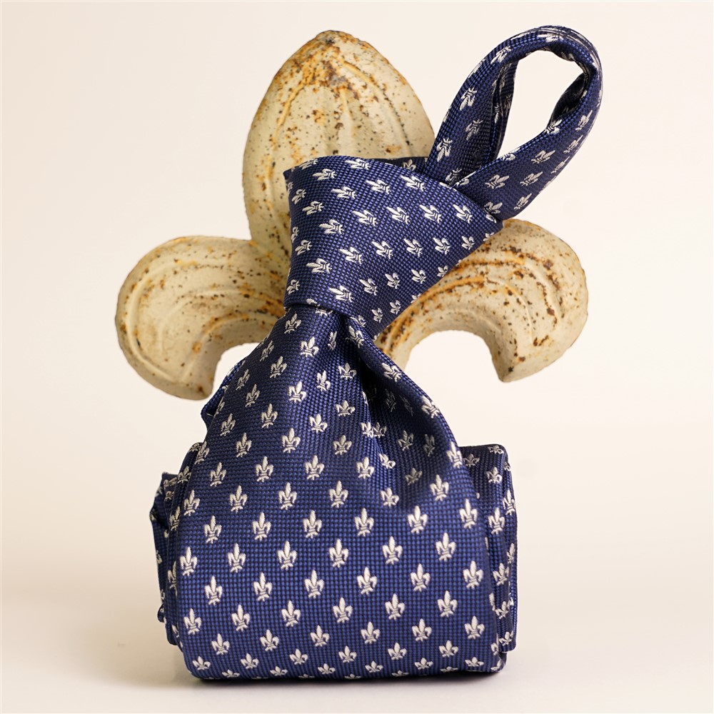 Cravatta azzurra scura con gigli argento in seta tinta in filo. Dopo più di 30 anni siamo riusciti a trovare la giusta chiave per rendere il nostro giglio, simbolo di Firenze, un motivo sobrio ed elegante per una cravatta. Ne abbiamo stilizzato il disegno e studiato il giusto rapporto e finalmente selezionando con varie prove i colori giusti abbiamo ottenuto questa cravatta, cucita a mano con seta realizzata in esclusiva per noi a Como. Dimensione cm 150 pala di 8 cm.