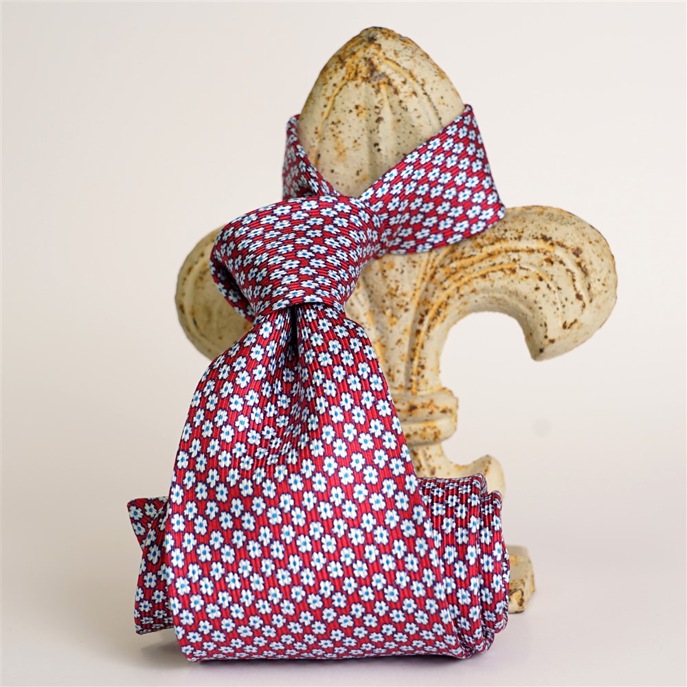 Cravatta di twill stampato peonia con fiorellini bianchi e celesti. Seta tessuta e stampata a Como su nostro disegno. Larghezza della pala della cravatta cm 7,5 lunghezza 150 cm cucita a mano a Firenze.