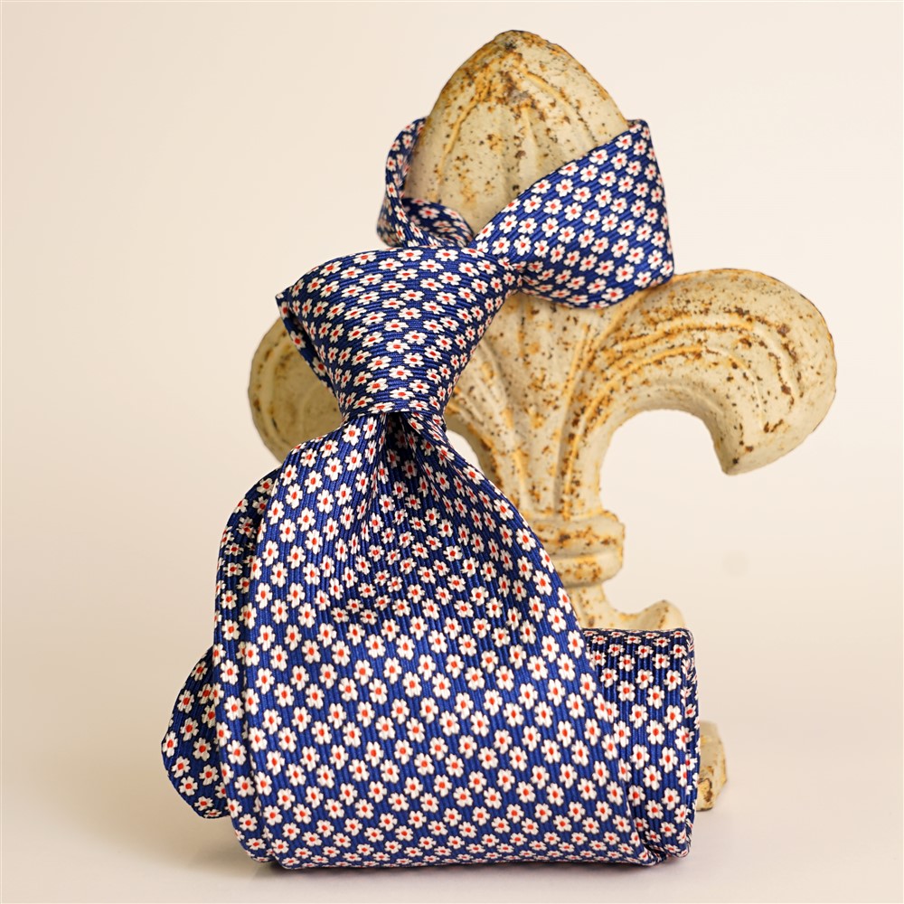 Cravatta stampata blu oltremare con fiorellini bianchi e rossi. Seta crepe dè Chine tessuta e stampata a Como su nostro disegno. Larghezza della pala della cravatta cm 7,5 lunghezza 150 cm cucita a mano a Firenze.