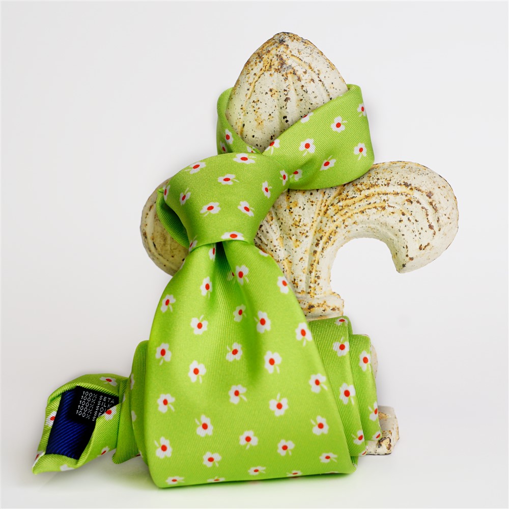 Cravatta verde acido con fiorellini bianchi con pistillo rosso in seta di twill stampata per noi a Como. Cucita a mano nel nostro laboratorio. Dimensioni lunghezza 150 cm larghezza pala 7,5 cm.