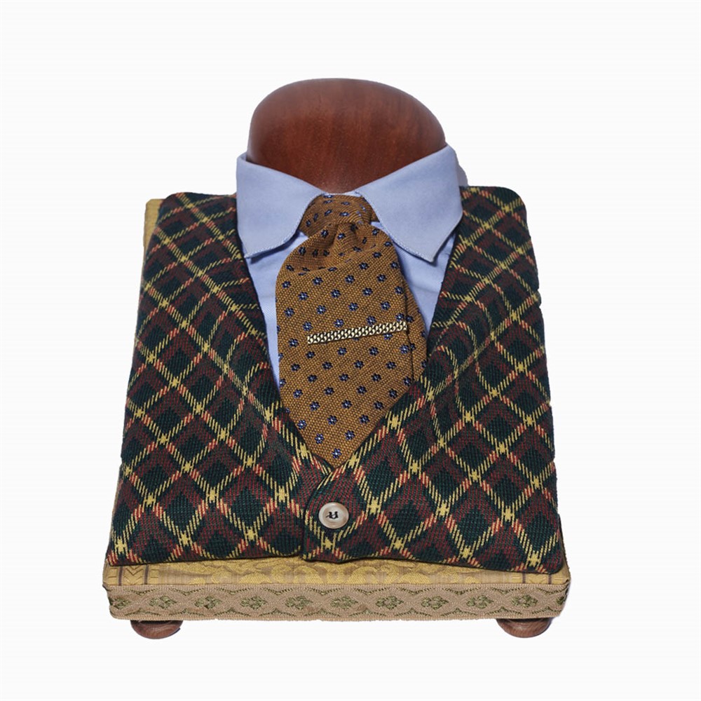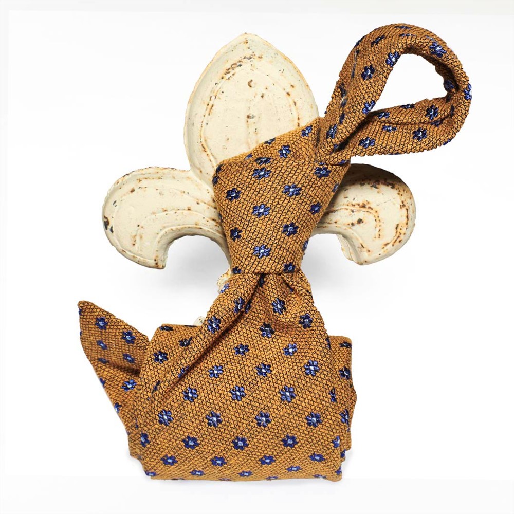 Cravatta ocra con piccole margherite blu con pistillo celeste in seta bourette, tessuta per noi a Como e cucita a mano. Larghezza pala 7.5 cm e lunghezza cm 150.