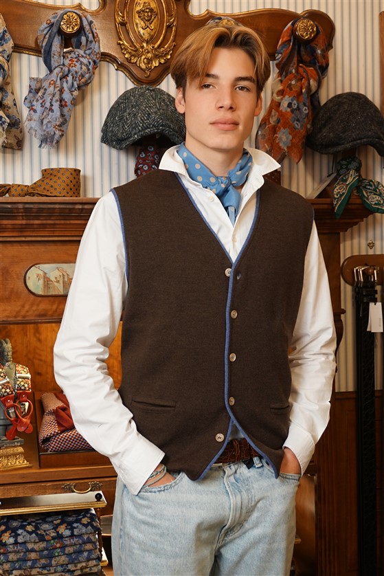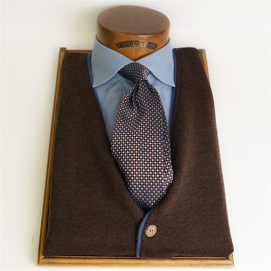 Gilet unito marrone testa di moro con bordo blu con bottoni e taschine in pura lana merino fatta in Italia.