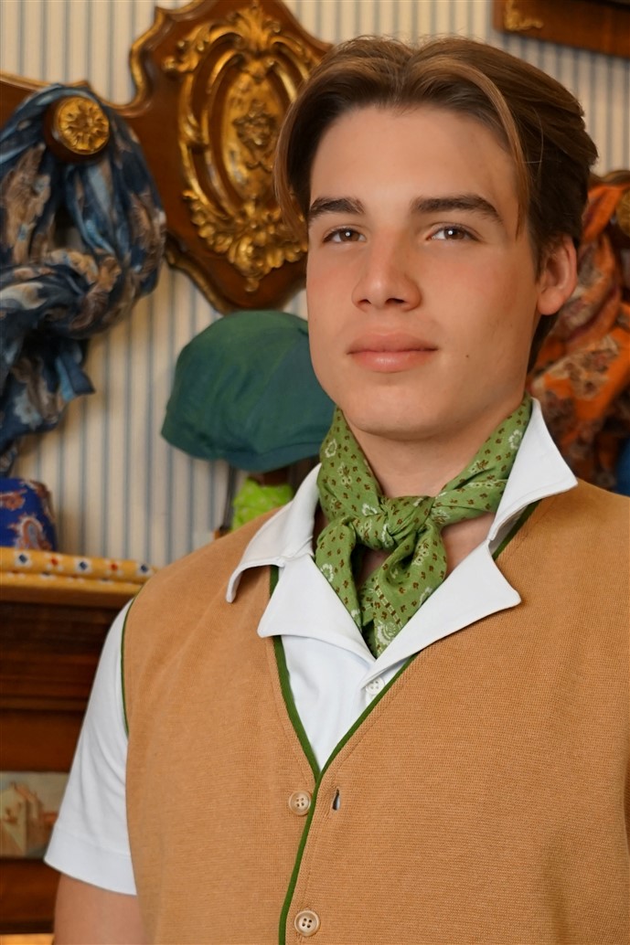 Gilet unito nocciola con bordo verde con bottoni e taschine in puro cotone fatto in Italia. Lavabile in acqua a 30 gradi a mano.