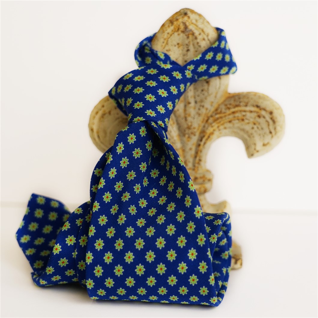 Cravatta in seta stampata azzurra con fiorellini verde chiaro e pistillo rosso. Cucite a mano con sete realizzate per noi a Como.Dimensioni 150 cm lunghezza cm 7,5 larghezza pala.