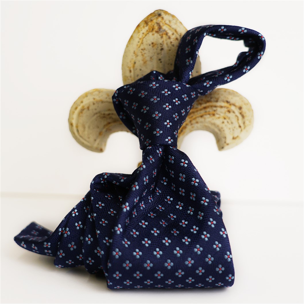 Cravatta in seta tinta in filo con fondo azzurro scuro e fiorellino azzurro cielo con pistillo rosso. Cucita a mano con seta realizzata per noi a Como. Dimensioni 150 cm di lunghezza.