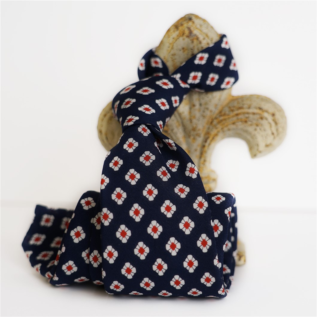 Cravatta in seta stampata con fondo blu fiorellino stilizzato bianco con pistillo rosso. Cucita a mano con seta realizzata per noi a Como.