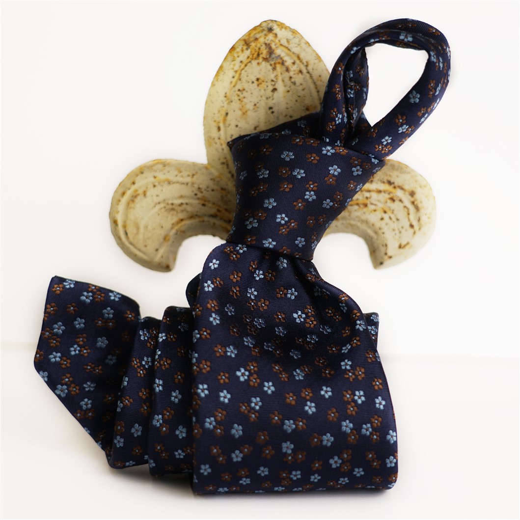 Cravatta navy blu in raso con fiorellini azzurri e caffè