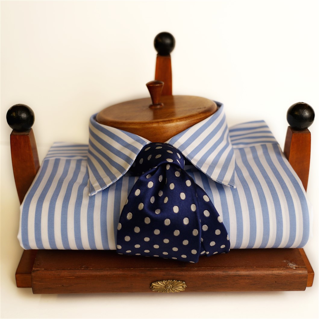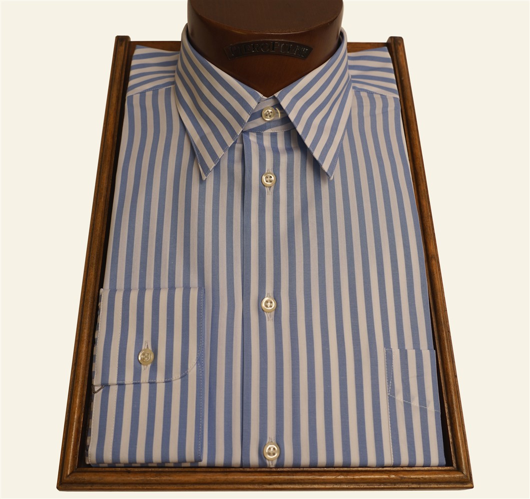 Camicia collo con bottoni nascosti in popeline a righe celesti e bianche. Lavabile in lavatrice. Confezionata nel nostro laboratorio artigiano.