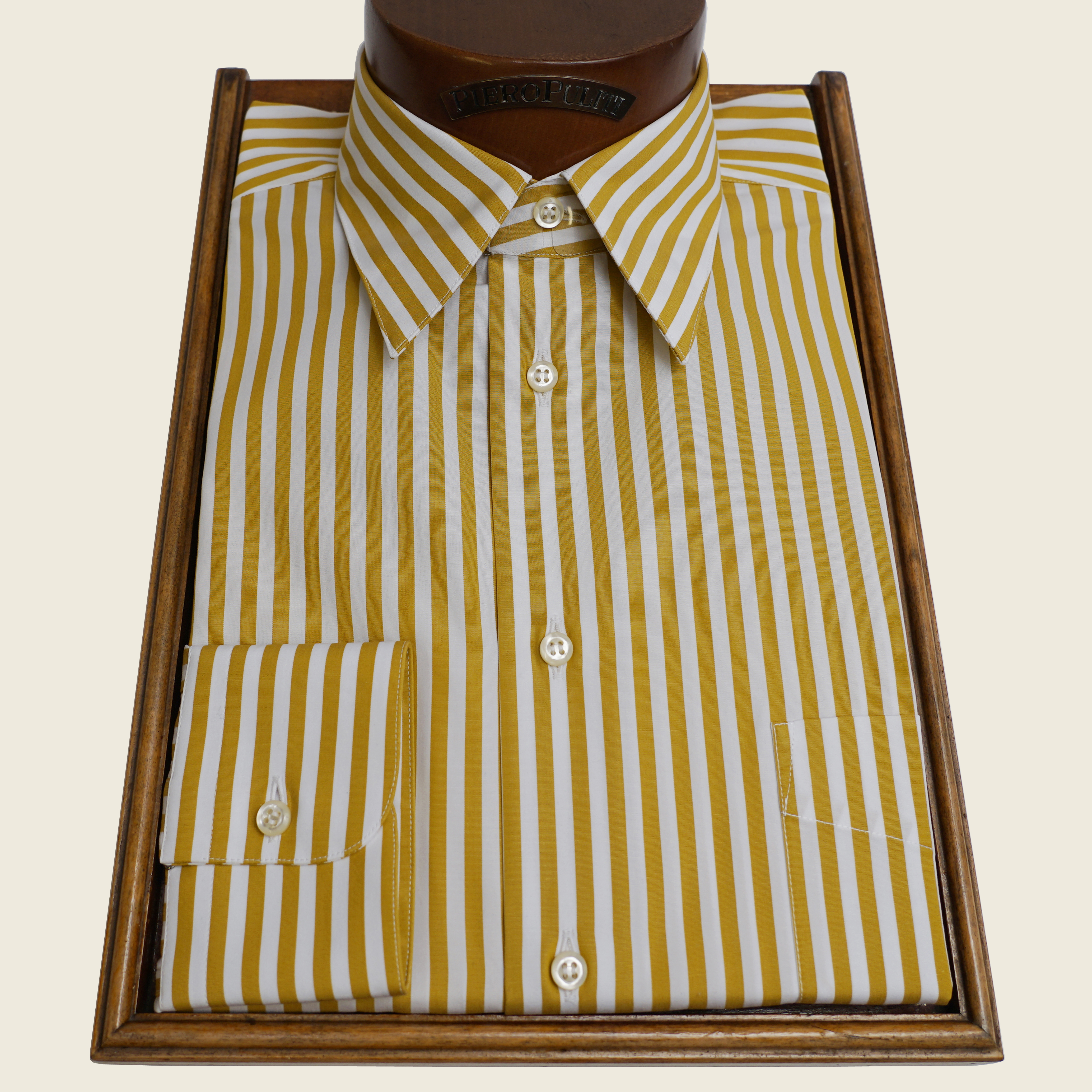 Camicia collo con bottoni nascosti in popeline a righe giallo senape e bianche. Lavabile in lavatrice. Confezionata nel nostro laboratorio artigiano.