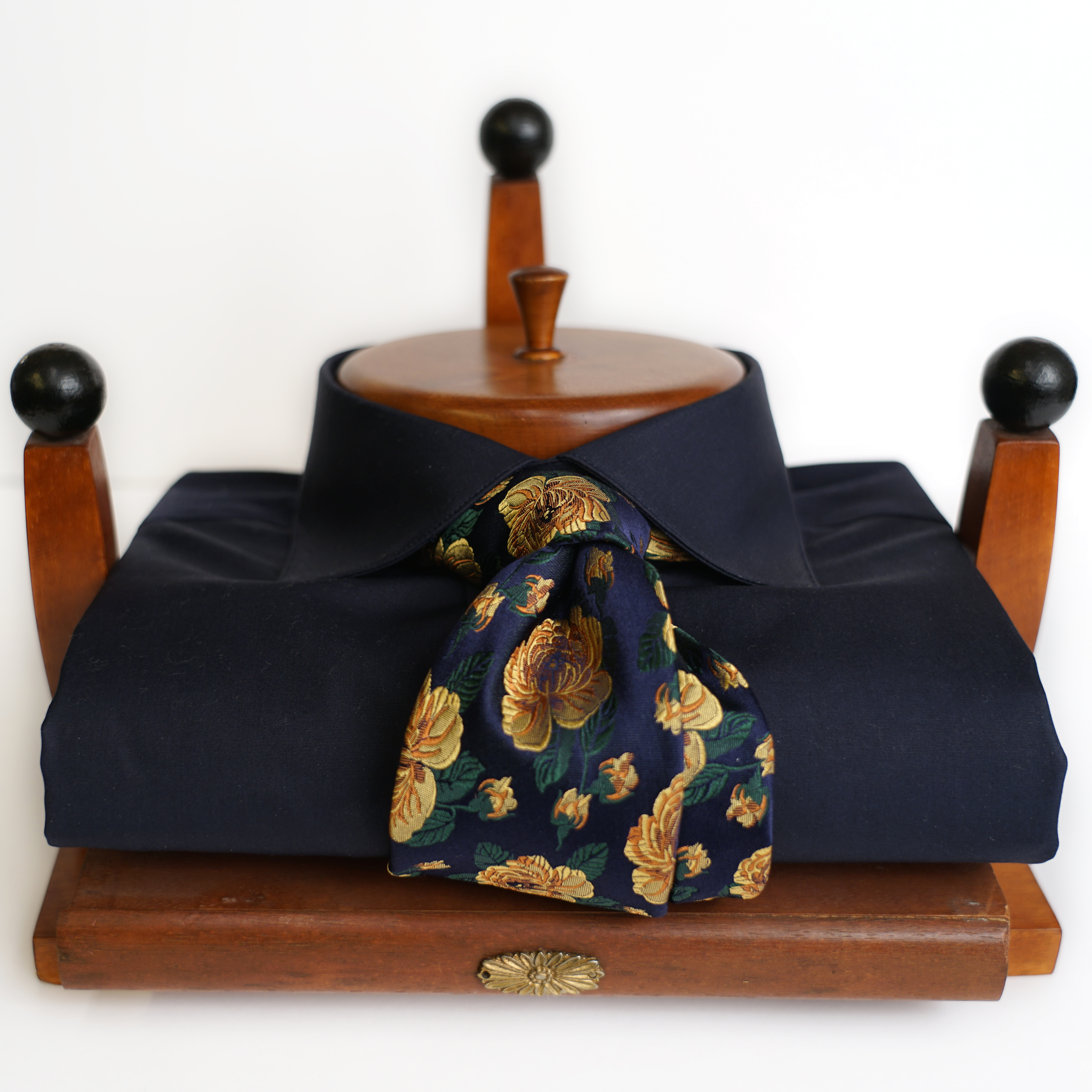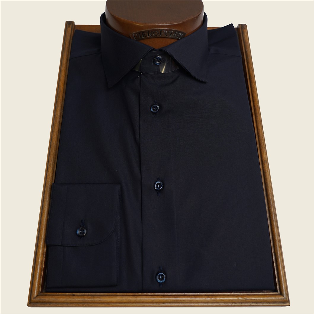 Camicia collo francese con stecca estraibile in tessuto di cotone 100% doppio ritorto blu scuro. Confezione artigianale e tessuti rigorosamente realizzati in Italia. Lavabile in lavatrice, da stirare al rovescio per evitare d scolorire il collo e i polsi.