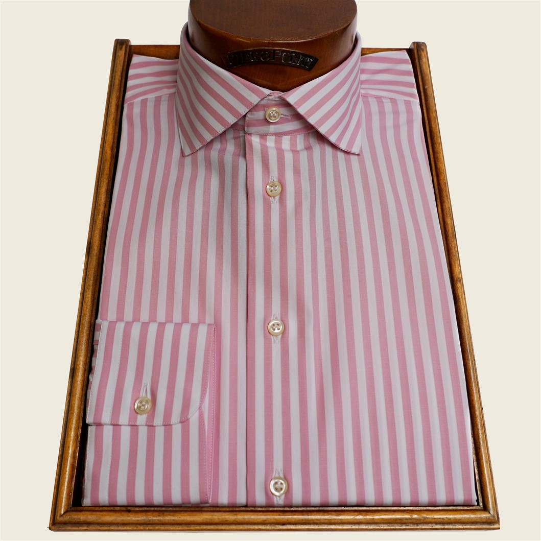 Camicia collo francese con stecca estraibile in popeline a righe rosa e bianche. Lavabile in lavatrice. Confezionata nel nostro laboratorio artigiano.