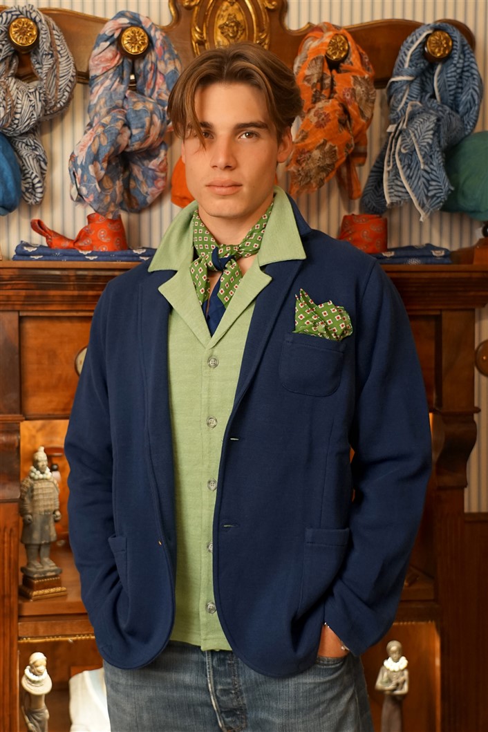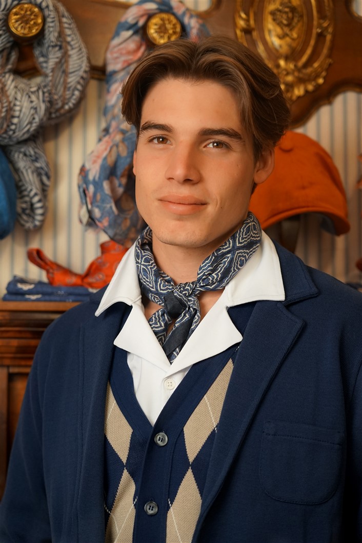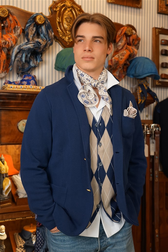 Bandana con fondo cammello con rose rosse e fiordalisi azzurri e con bordo rosso, in crèpe de Chine di pura seta. Disegno originale realizzato per noi a Como e realizzata a mano. Dimensioni 61 cm per 61 cm. Ideale per essere usata al posto della cravatta dentro la camicia.