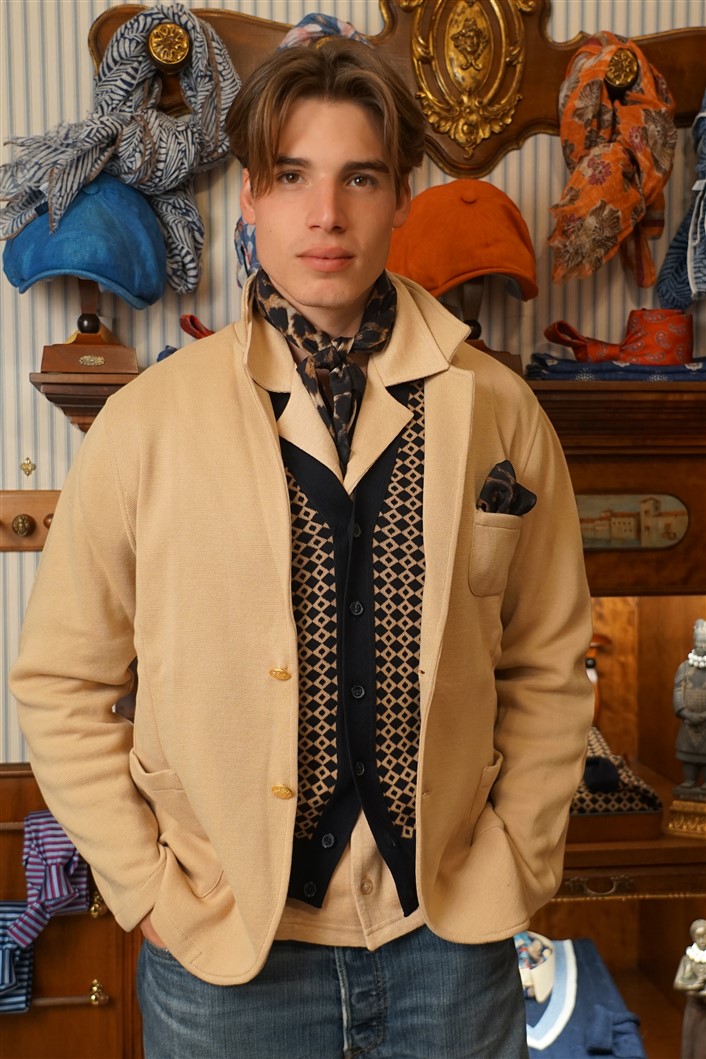 Blazer colore sabbia con tasche e taschino e bottoni oro, sfoderato in puro cotone.