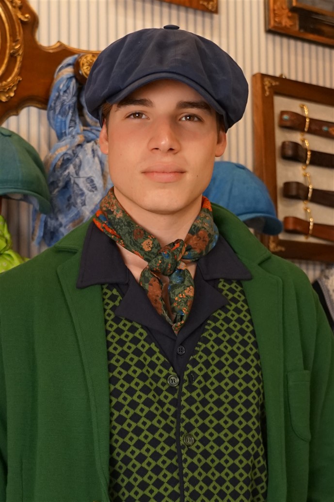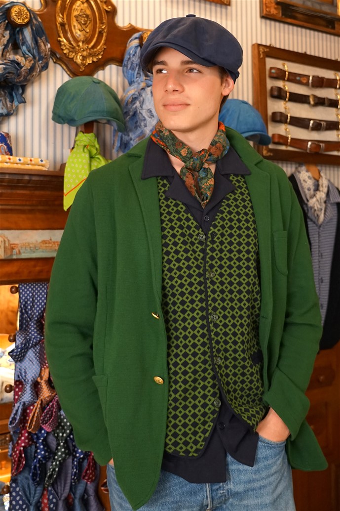 Blazer colore verde con tasche e taschino e bottoni oro, sfoderato in puro cotone.
