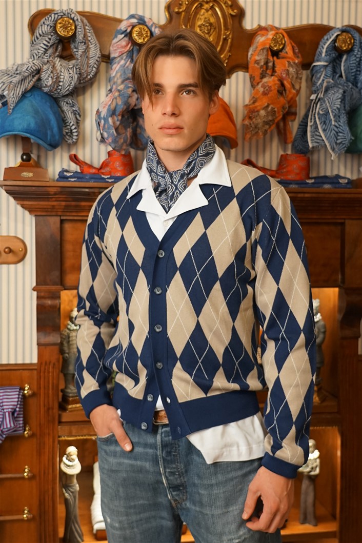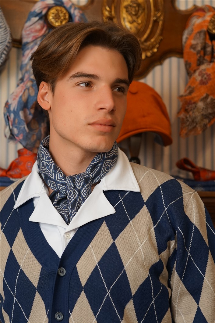 Bandana con fondo cammello con rose rosse e fiordalisi azzurri e con bordo rosso, in crèpe de Chine di pura seta. Disegno originale realizzato per noi a Como e realizzata a mano. Dimensioni 61 cm per 61 cm. Ideale per essere usata al posto della cravatta dentro la camicia.