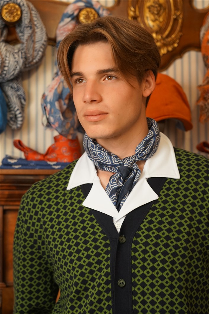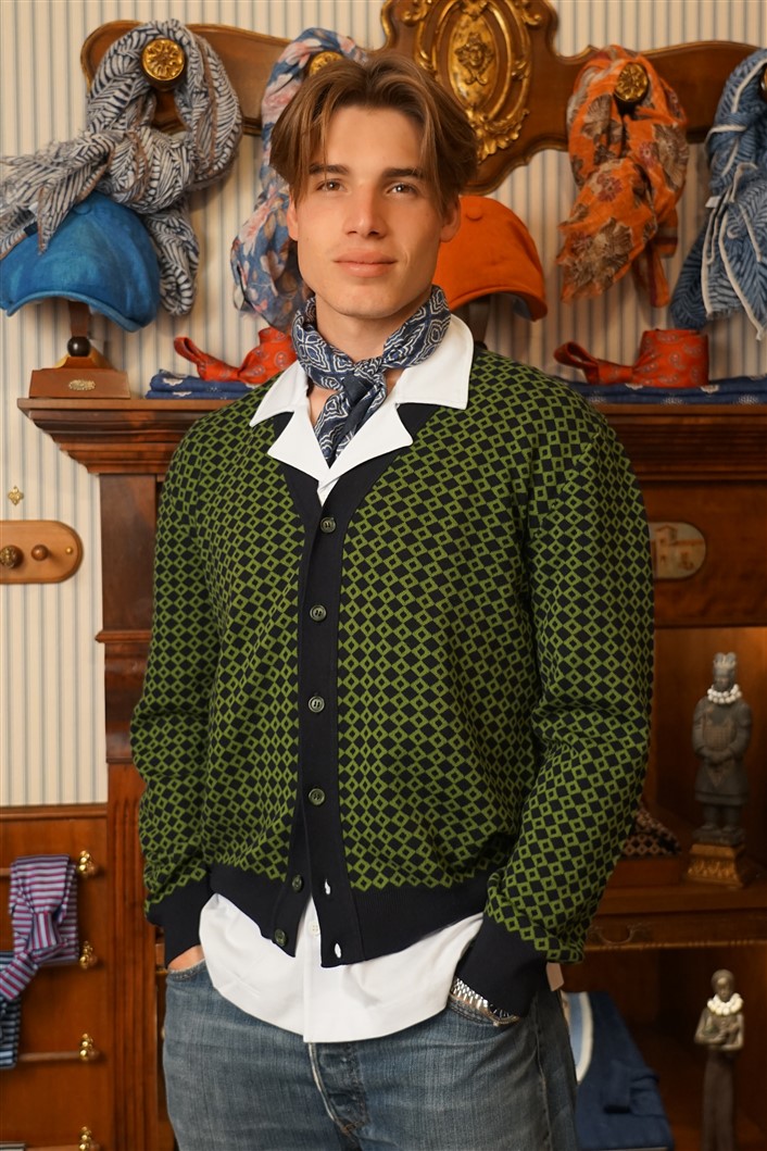 Cardigan motivi geometrici verde e blu 100% cotone