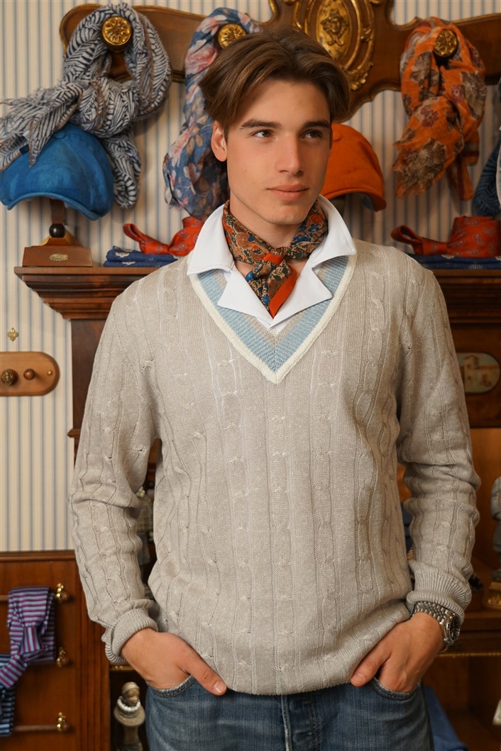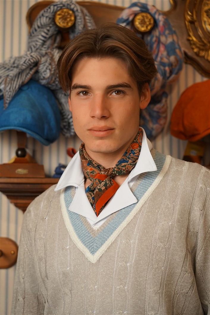 Bandana con fondo cammello con rose rosse e fiordalisi azzurri e con bordo rosso, in crèpe de Chine di pura seta. Disegno originale realizzato per noi a Como e realizzata a mano. Dimensioni 61 cm per 61 cm. Ideale per essere usata al posto della cravatta dentro la camicia.