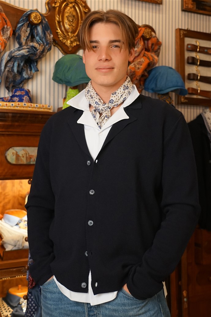Cardigan uomo modello corto e dritto sui fianche con rever tipo giacca abbottonato. In puro cotone 100% nel classico colore blu navy .