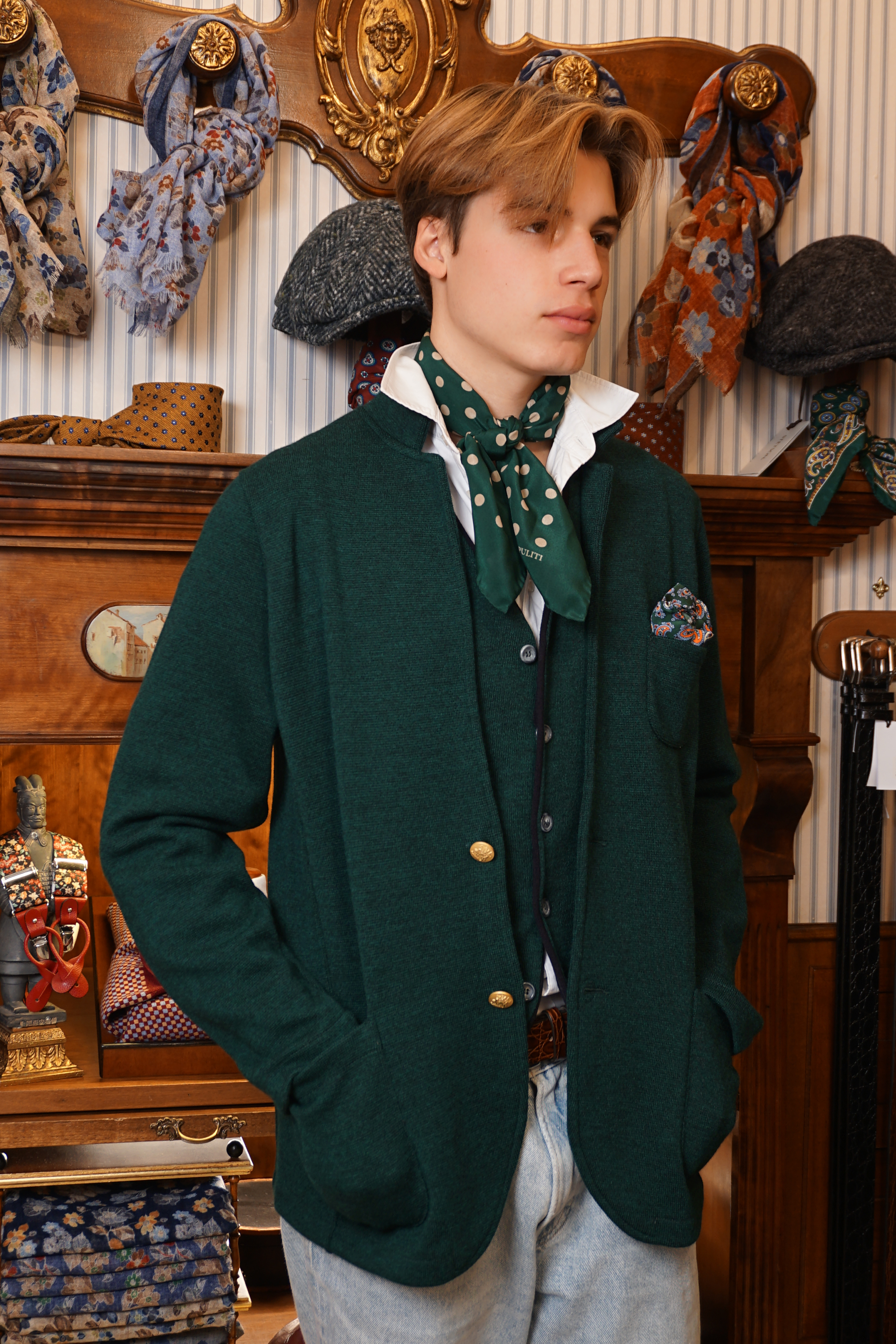 Bandana con fondo cammello con rose rosse e fiordalisi azzurri e con bordo rosso, in crèpe de Chine di pura seta. Disegno originale realizzato per noi a Como e realizzata a mano. Dimensioni 61 cm per 61 cm. Ideale per essere usata al posto della cravatta dentro la camicia.