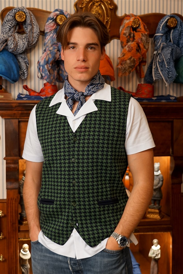 Gilet pied de poule blu e verde in pura lana merino 100%