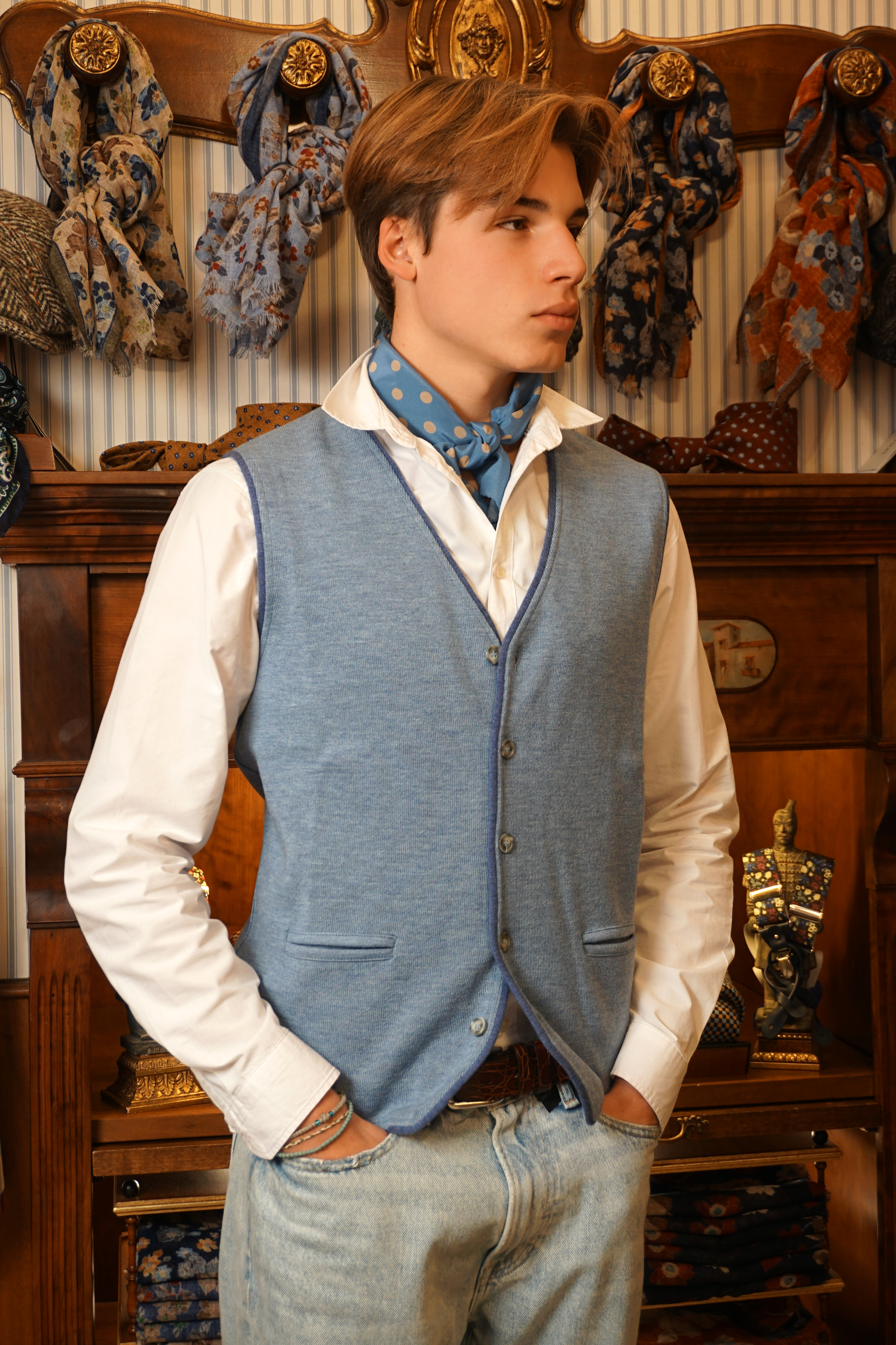 Bandana con fondo cammello con rose rosse e fiordalisi azzurri e con bordo rosso, in crèpe de Chine di pura seta. Disegno originale realizzato per noi a Como e realizzata a mano. Dimensioni 61 cm per 61 cm. Ideale per essere usata al posto della cravatta dentro la camicia.