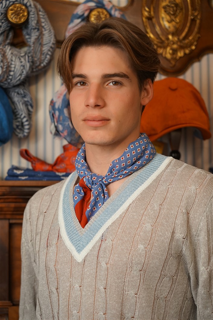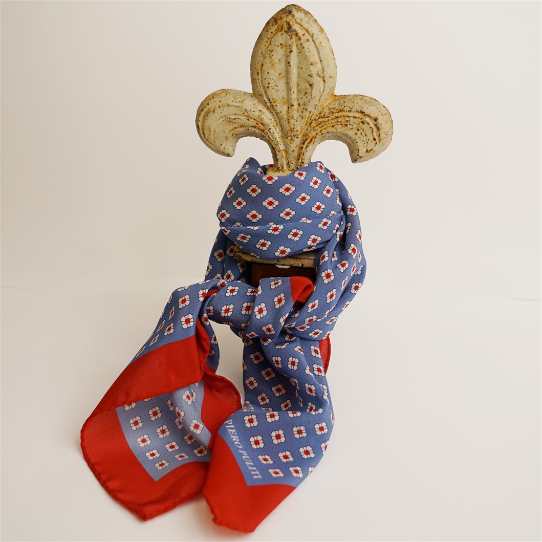 Bandana azzurra con fiori bianchi geometrici e bordo rosso in crèpe de Chine di pura seta. Disegno originale realizzato per noi a Como e realizzata a mano. Dimensioni 61 cm per 61 cm. Ideale per essere usata al posto della cravatta dentro la camicia.