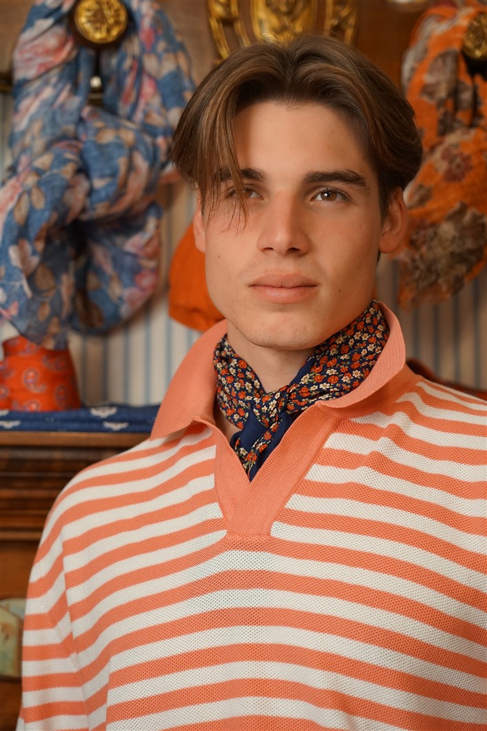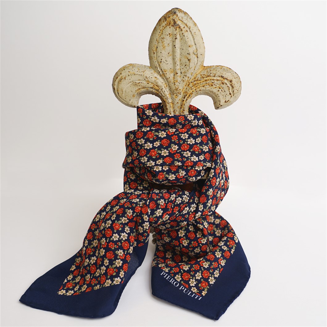 Bandana con fondo blu scuro e fiori multicolori, in crèpe de Chine di pura seta. Disegno originale realizzato per noi a Como e realizzata a mano. Dimensioni 61 cm per 61 cm. Ideale per essere usata al posto della cravatta dentro la camicia.