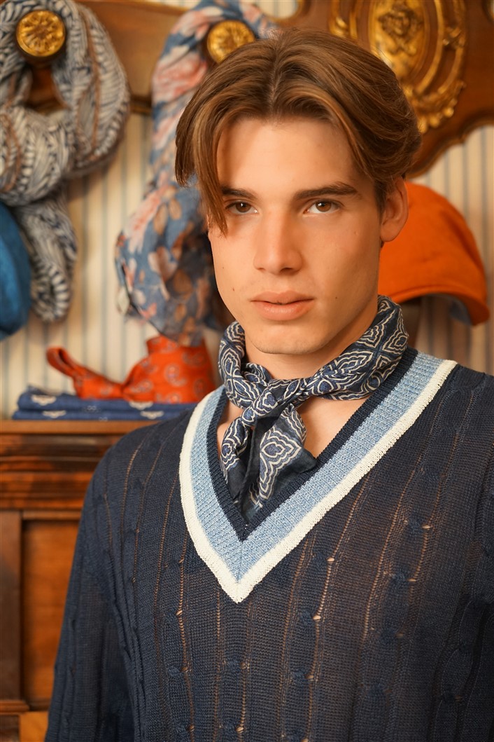 Bandana con fondo cammello con rose rosse e fiordalisi azzurri e con bordo rosso, in crèpe de Chine di pura seta. Disegno originale realizzato per noi a Como e realizzata a mano. Dimensioni 61 cm per 61 cm. Ideale per essere usata al posto della cravatta dentro la camicia.