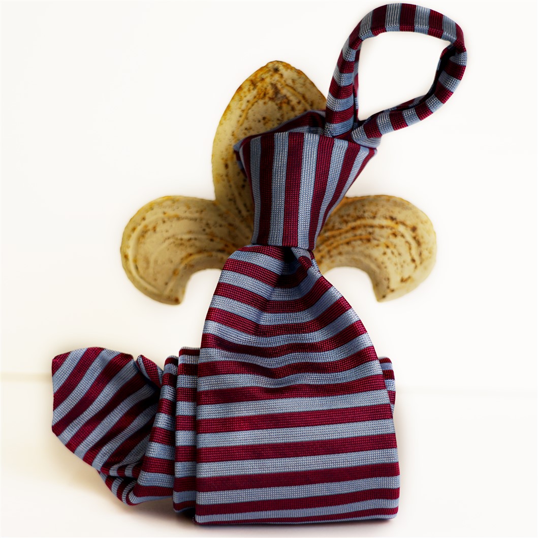 Cravatta riga orizzontale magenta e azzurro in seta tinta in filo realizzata per noi a Como. Lunghezza cravatta cm 150 larghezza pala 7,5 cm. Cucita a mano.