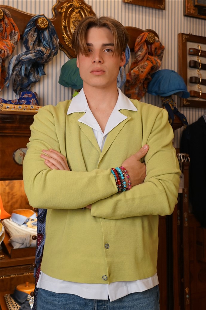 Cardigan uomo modello corto e dritto sui fianche con rever tipo giacca abbottonato. In puro cotone 100% nel colore verde pistacchio ideale per l'estate.